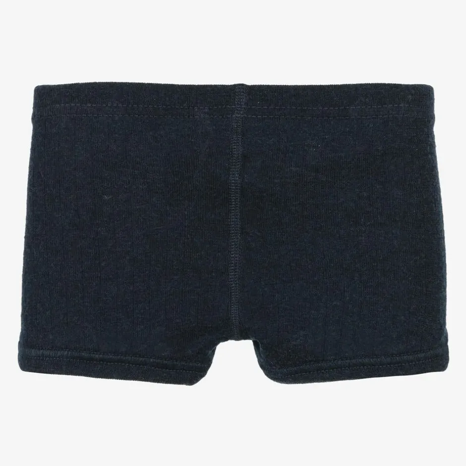 Navy blue thermal boxer shorts for boys by Joha, made from a luxurious, soft and lightweight Merino wool jersey. Comfortable to wear, they have an elasticated waistband and feature a striped rainbow logo tab on the front.