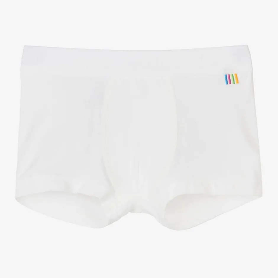White thermal boxer shorts for boys by Joha, made from a luxurious organic viscose bamboo jersey. They have a comfortable elasticated waistband, with a striped rainbow logo tab on the front.