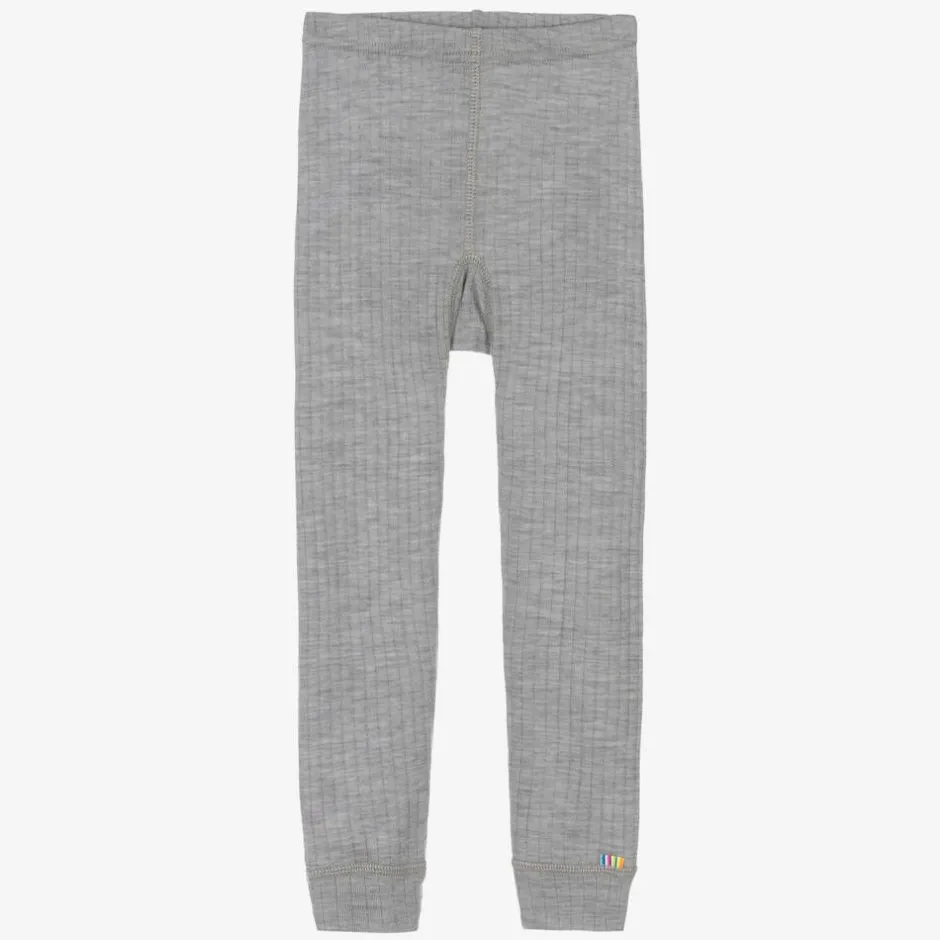 Grey thermal leggings for boys and girls by Joha, made in super soft and stretchy ribbed Merino wool. These comfortable leggings can be used for layering when the weather gets colder or can be worn alone. The waistband and cuffs are both gently elasticated and the brand's colourful striped logo tab features on one leg.