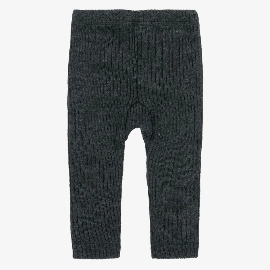 A pair of dark grey thermal leggings for little boys and girls by Joha, made in a beautifully soft, ribbed Merino wool. Cosy and warm, they are ideal as an extra layer when the weather turns colder, or they can be worn as comfortable leggings. The waistband is gently elasticated for comfort and there is a striped logo tab stitched on one side seam.
