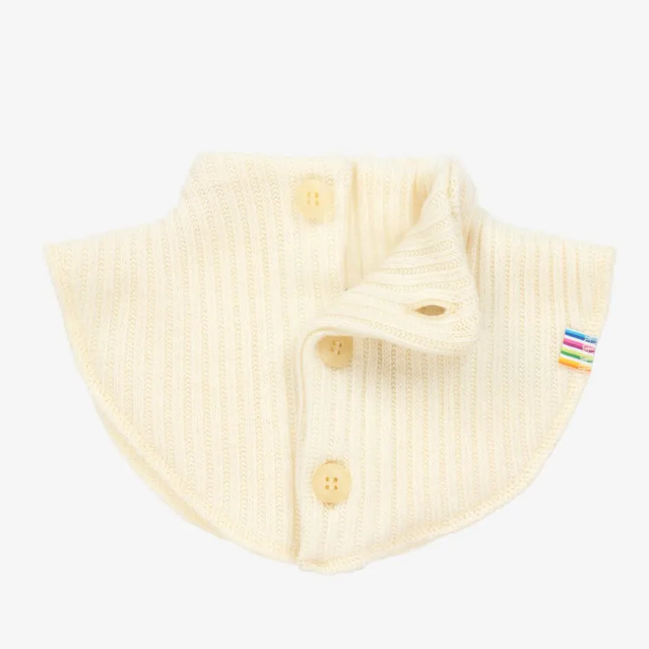 An ivory thermal neck warmer for boys and girls by Joha, knitted in softly ribbed Merino wool. Designed to keep them cosy, it is double-layered and fastens neatly at the front with buttons.