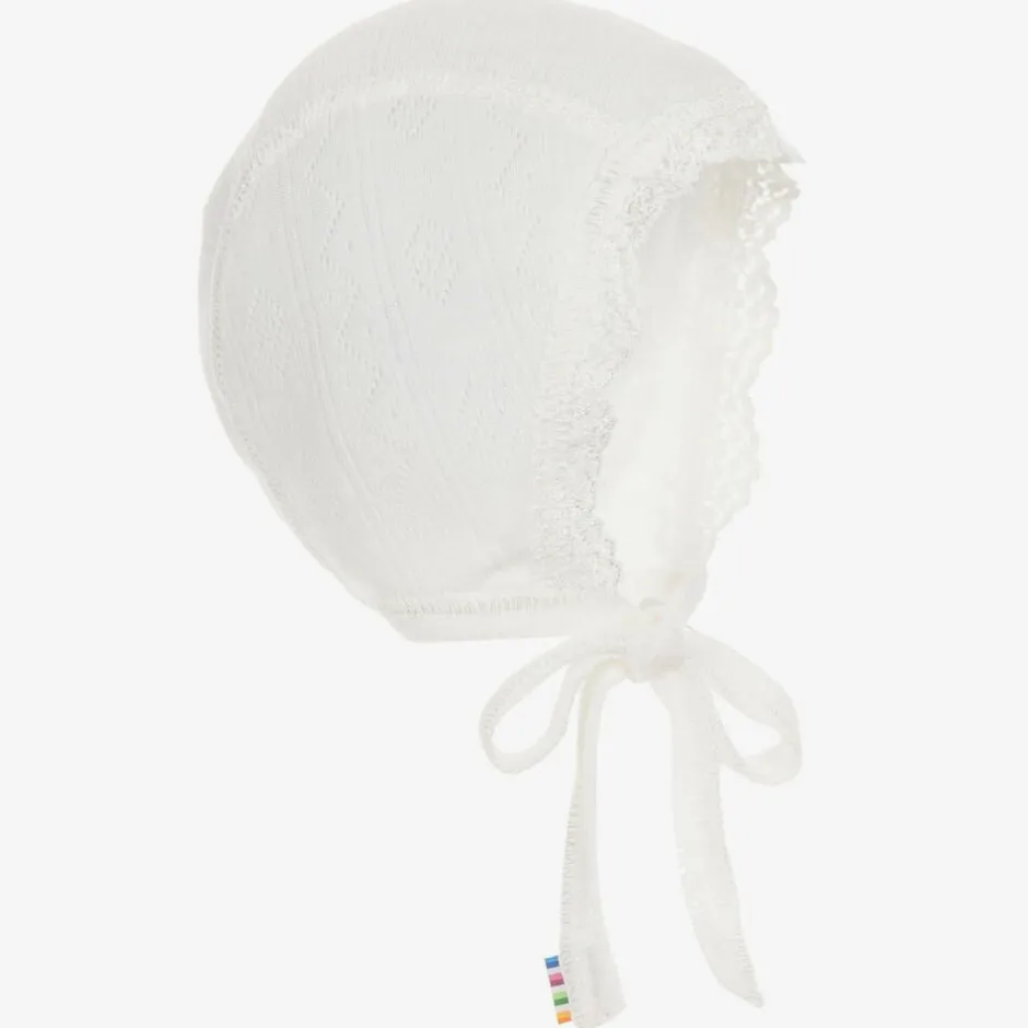 Sweet ivory thermal hat with lace trims for baby girls by Joha. Made in a soft Merino wool and silk blend, it covers the ears for added warmth, and ties under the chin with straps.