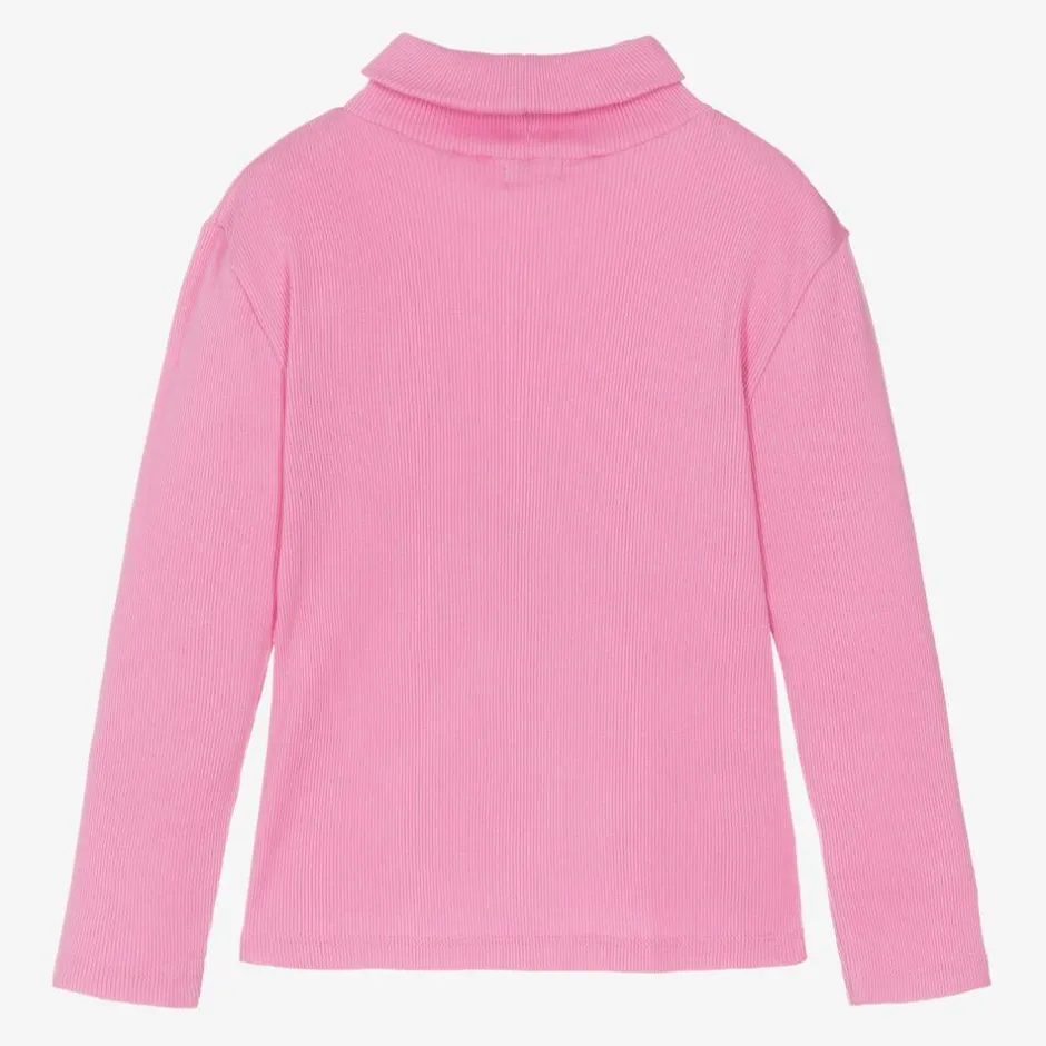 Pink cotton roll neck top for girls by British brand Joyday, exclusive to Childrensalon. Made in comfortable, ribbed jersey with a skinny fit and long sleeves, it is great for cooler weather and ideal as a layering piece.