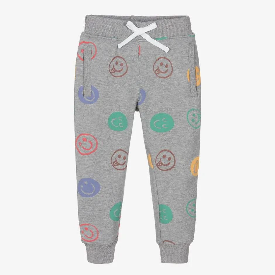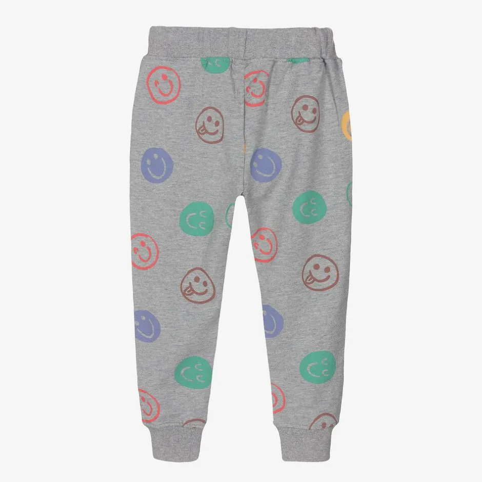 Fun grey marl cotton joggers for boys and girls by Joyday, exclusive to Childrensalon. Made in comfortable jersey for casual days, they have a colourful print of happy faces and neat ribbed trims. The ribbed waistband has a white drawstring for a great fit, and there are useful pockets on the front.