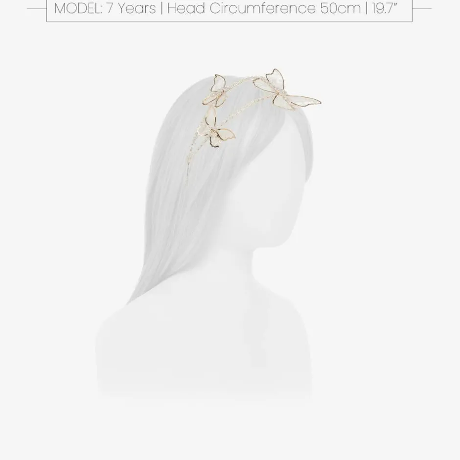 Stunning special occasion hairband for girls by Junona. A beautiful finishing touch to her outfit, this double stranded metal hairband is trimmed with ivory and crystal beads for a hint of sparkle. Delicate ivory lace and gold metal butterfly decorations add a beautiful touch . The flexible metal band has looped ends where ribbon ties can be attached for a pretty finish.