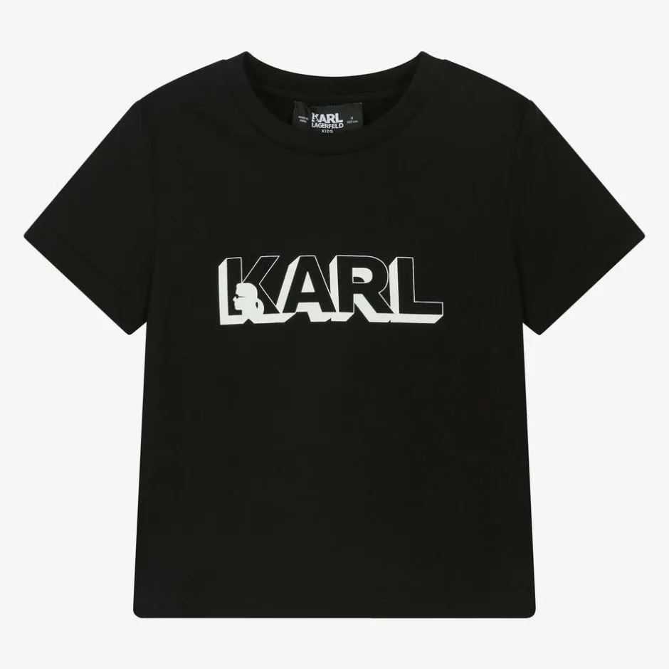 Classic, black organic cotton T-shirt for boys by KARL LAGERFELD KIDS. For instant brand recognition, it has a white, 3D logo printed on the chest, and another logo printed on the back of one shoulder. Ideal for casual, relaxed days, this short-sleeved tee is made in soft, comfortable jersey.