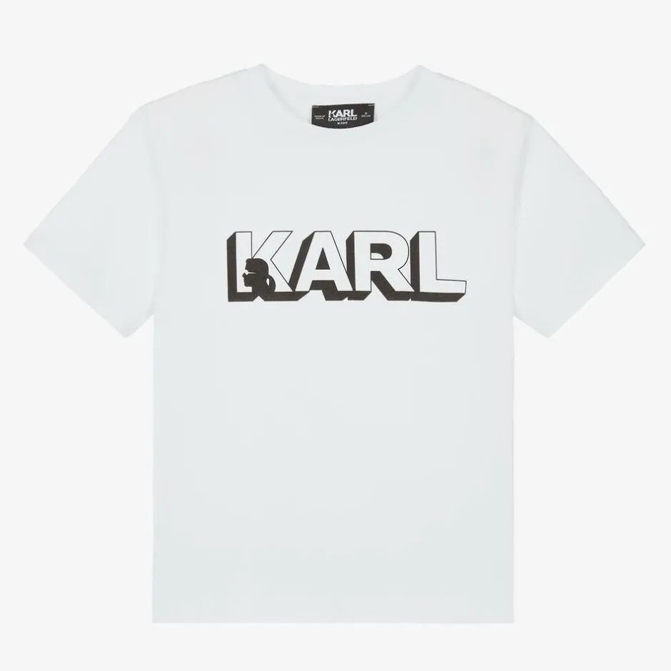Classic, white organic cotton T-shirt for boys by KARL LAGERFELD KIDS. For instant brand recognition, it has a black, 3D logo printed on the chest, and another logo printed on the back of one shoulder. Ideal for casual, relaxed days, this short-sleeved tee is made in soft, comfortable jersey.