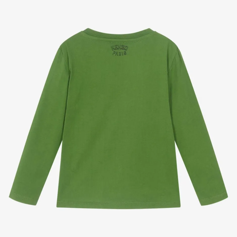 Green long-sleeved T-shirt for boys by KENZO KIDS, with the French brand's bold Varsity Tiger print on the front. It is made from soft cotton jersey with a finely ribbed crew neck and a Kenzo Paris logo printed on the back.