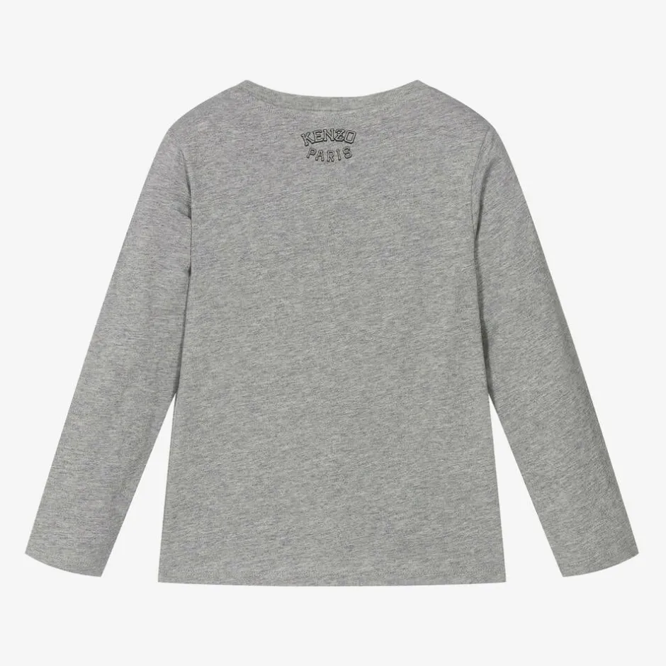 Grey marl long-sleeved T-shirt for boys by KENZO KIDS, with the French brand's bold Varsity Tiger print on the front. It is made from soft cotton jersey with a finely ribbed crew neck and a Kenzo Paris logo printed on the back.