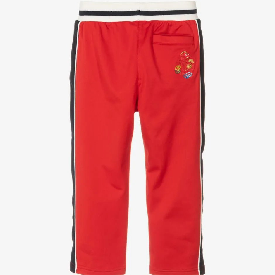 Red zip-up joggers for boys by luxury brand KENZO KIDS, with navy blue and white trims. As part of the Lunar New Year capsule collection, they have Chinese-inspired snake embroidery and logos. The joggers are made in comfortable jersey with a soft, brushed inside, and are easy to wear, simply pulling up.