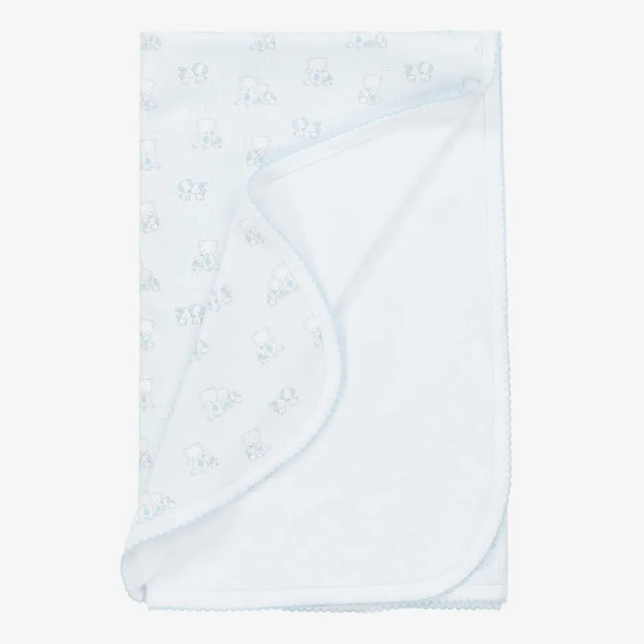 Pale blue blanket for baby boys by Kissy Kissy, patterned in tiny micro-dots with cute teddies and puppies. It is made in super soft Pima cotton jersey, with blue picot embroidery around the edges. Ideal for use in the pram or car seat, it also makes an attractive nursery accessory.