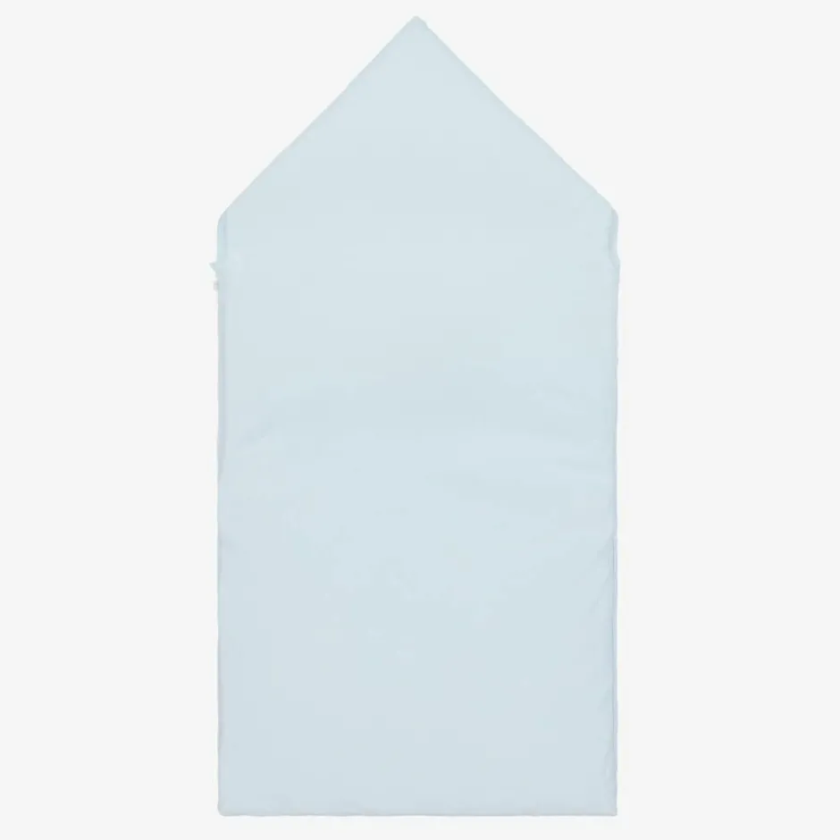 Lovely pale blue Pima cotton nest for baby boys by Kissy Kissy, an exclusive to Childrensalon. Beautifully soft to the touch and lightly padded for cosy comfort, this 3-tog jersey nest has a side zip fastening. There is an adorable blue train motif hand embroidered on the white front panel. The hood can be laid flat when the poppers are unfastened.