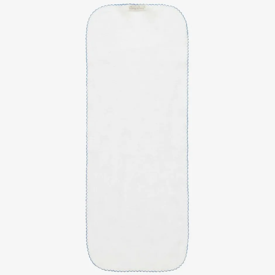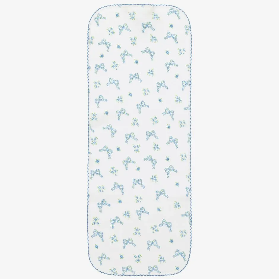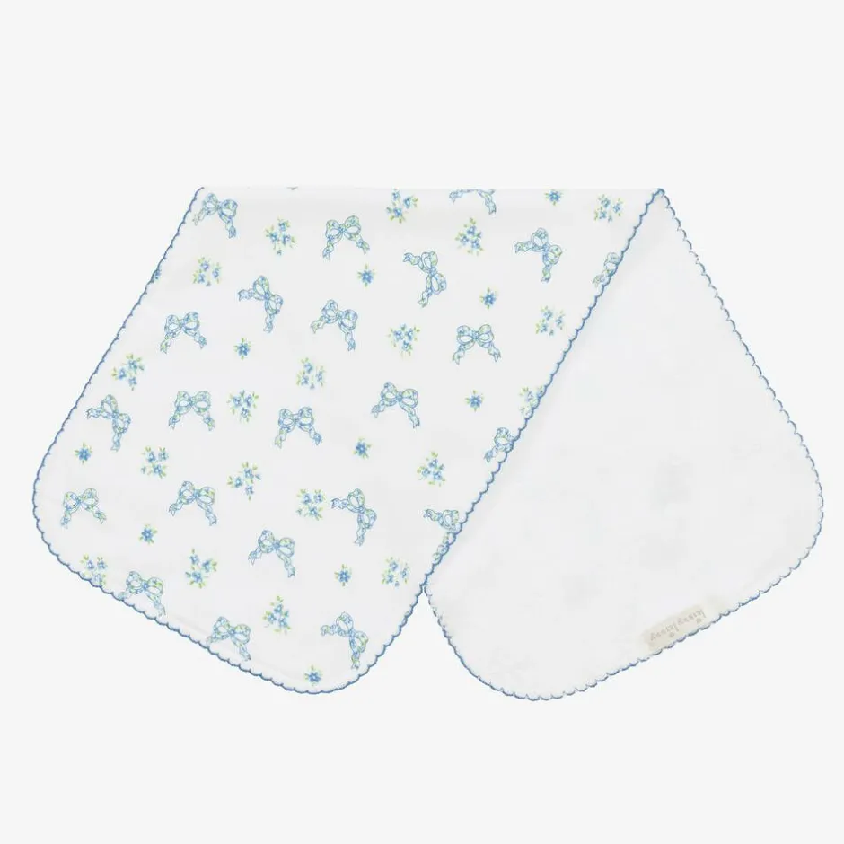 Sweet white burp cloth for baby girls by Kissy Kissy, with a lovely bow and floral print in blue and green. Made in beautifully soft Pima cotton jersey, it has an absorbent cotton towelling backing and blue picot trim. This useful feeding accessory can be placed over the shoulder when burping your baby and used for wiping those little spills after a feed.