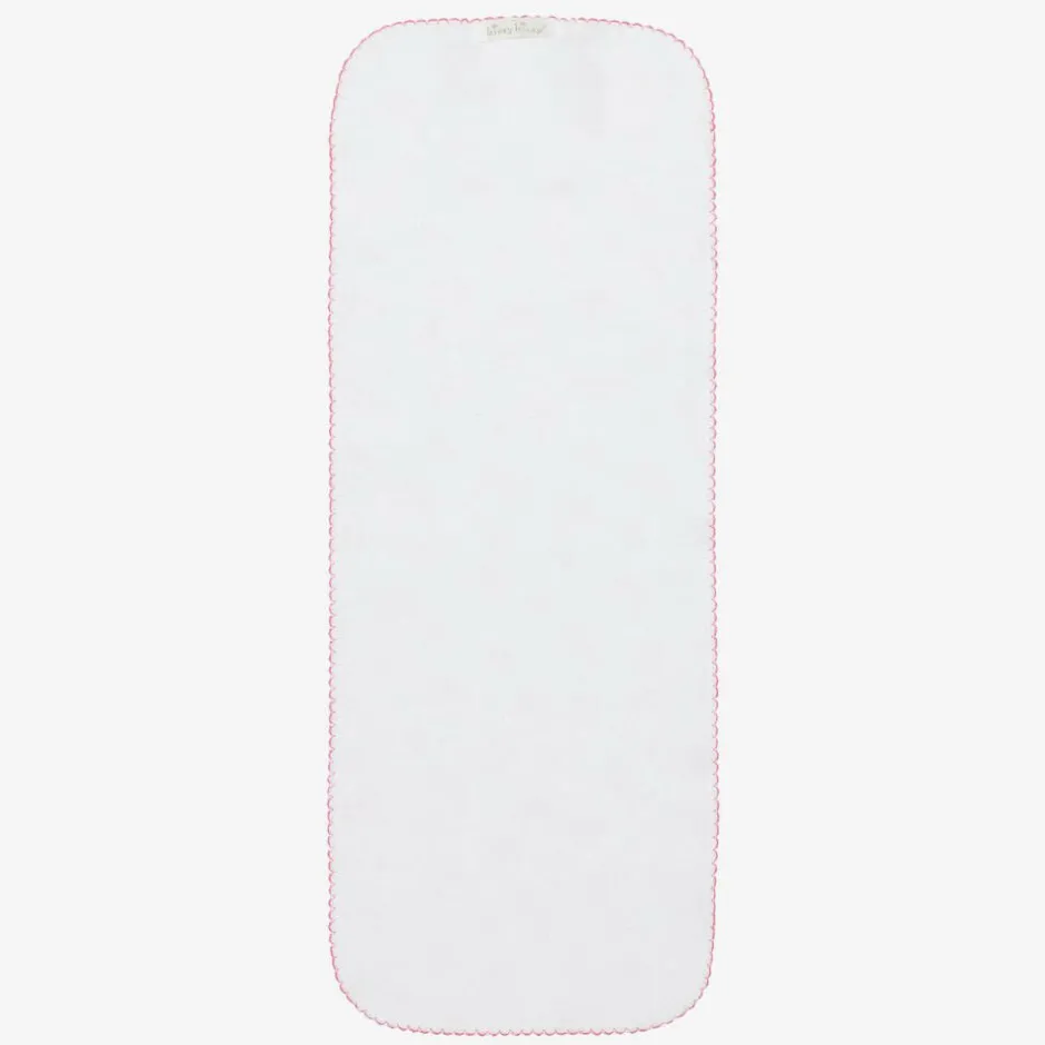 Sweet white burp cloth for baby girls by Kissy Kissy, with a lovely bow and floral print in pink and green. Made in beautifully soft Pima cotton jersey, it has an absorbent cotton towelling backing and pink picot trim. This useful feeding accessory can be placed over the shoulder when burping your baby and used for wiping those little spills after a feed.