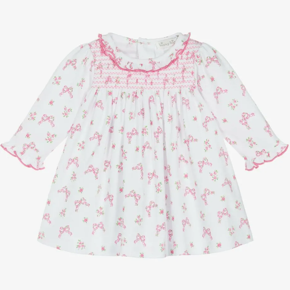 A traditionally styled white dress for baby girls by Kissy Kissy, with a pretty bow and floral pattern in pink and green. Made in super soft and comfortable Pima cotton jersey, it has a shirred panel across the front and delightful ruffle trims edged in pink embroidery. This sweet style fastens with poppers on the back and comes with matching knickers to complete the look.