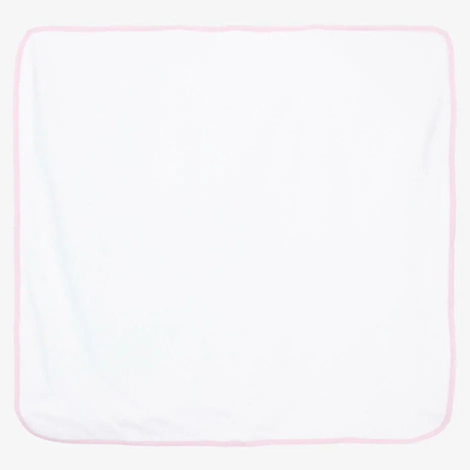 White cotton hooded towel and mitt set for baby girls by Kissy Kissy. Made in beautifully soft towelling, it has a pale pink jersey hood with an embroidered bear face, and matching trim. Ideal for bath time, it comes with a soft white mitt that has an elasticated, frilled cuff.