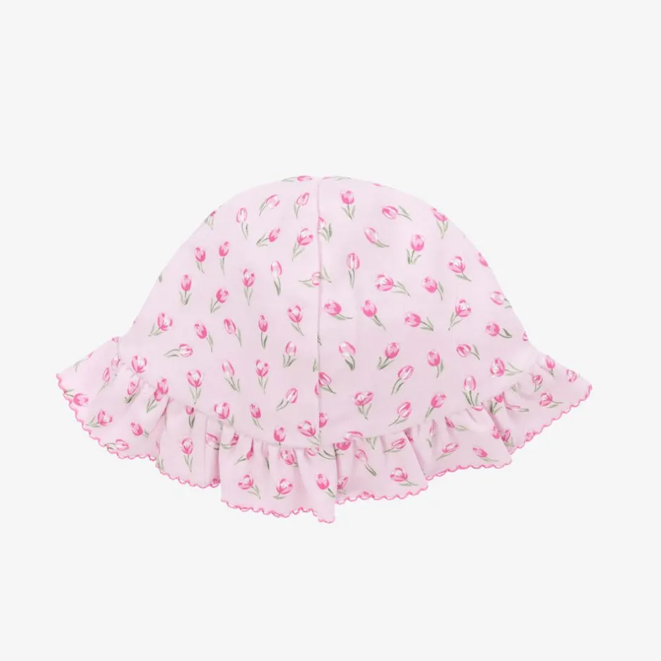 Pretty pink hat for baby girls from Kissy Kissy, made in super soft Pima cotton jersey. It has a sweet tulip pattern in shades of pink and green, and a ruffled brim with a delicate picot trim.