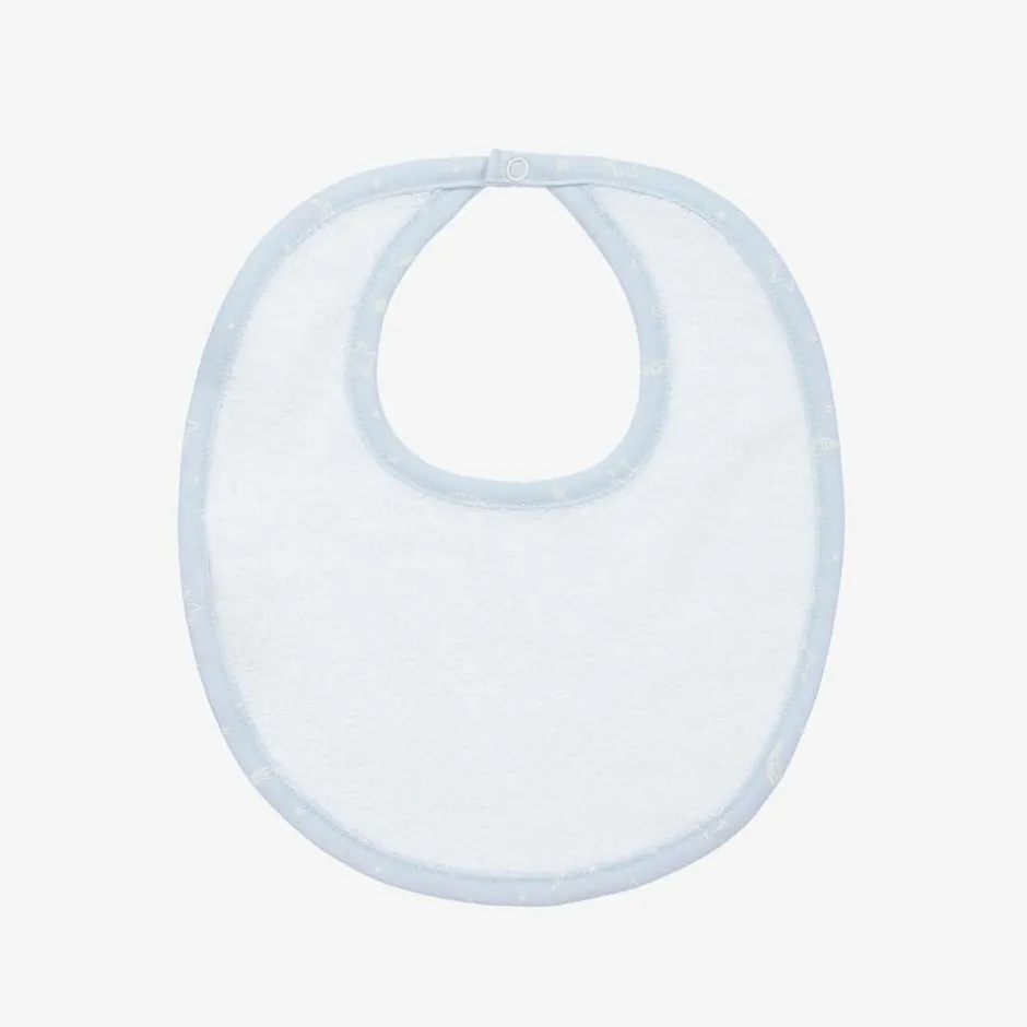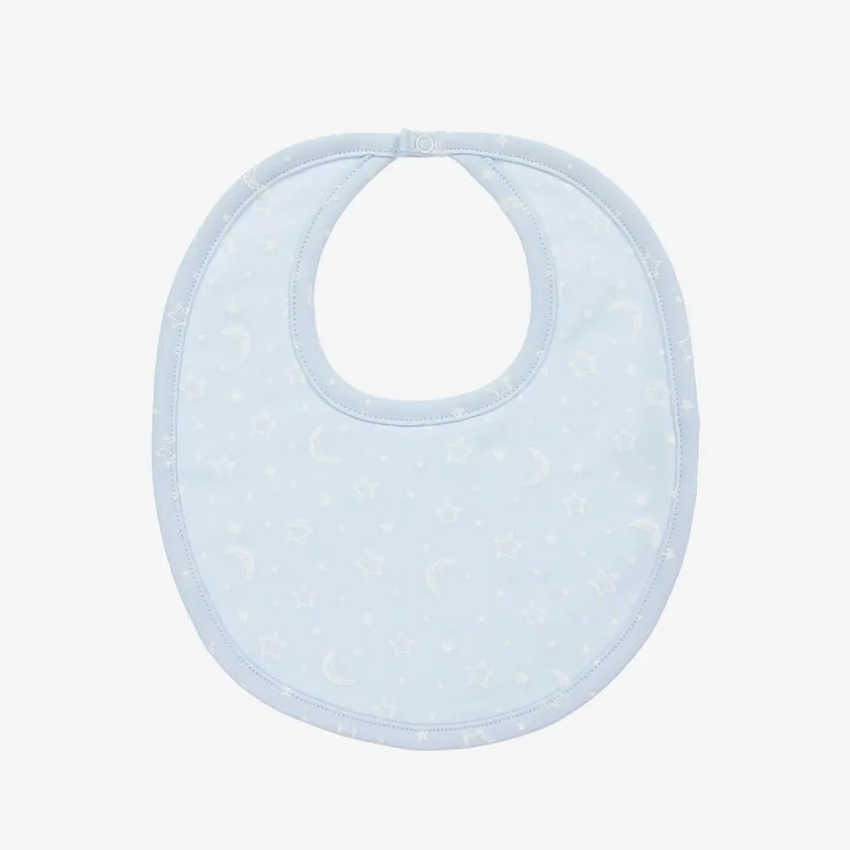 A light blue bib for baby boys by Kissy Kissy, patterned with stars and crescent moons. It is made in super-soft Pima cotton and designed with a towelling underside to help catch those little spills. There is a popper to secure the bib easily on the back of baby's neck.