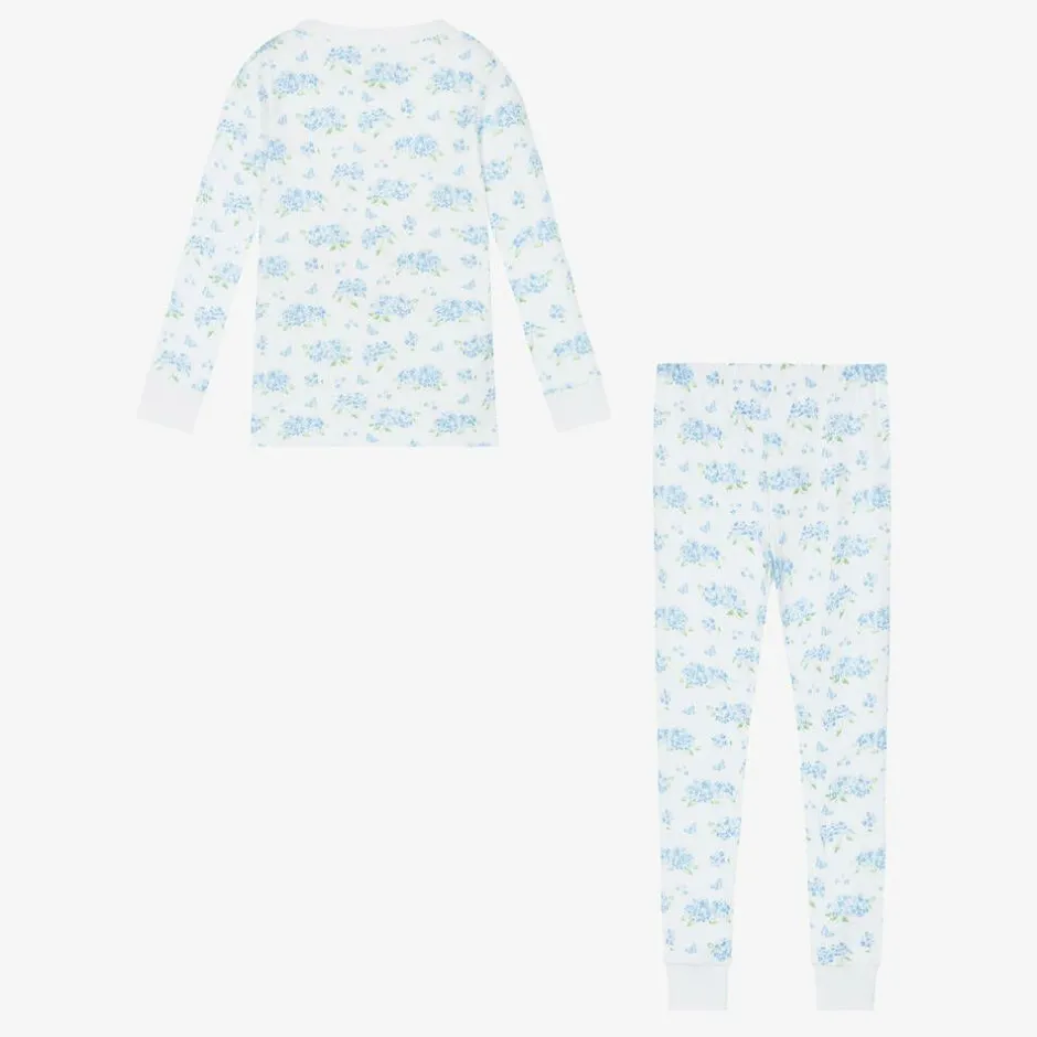 White Pima cotton pyjamas for girls by Kissy Kissy, with a beautiful blue hydrangea flower pattern. Snug-fitting, they are made in super soft jersey, ideal for a comfortable night's sleep.