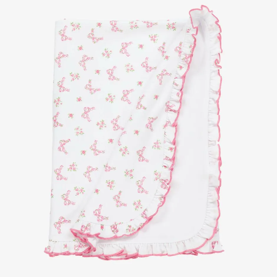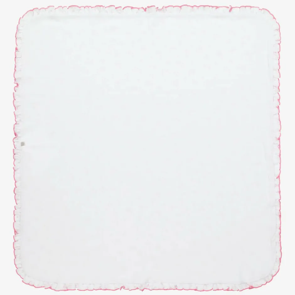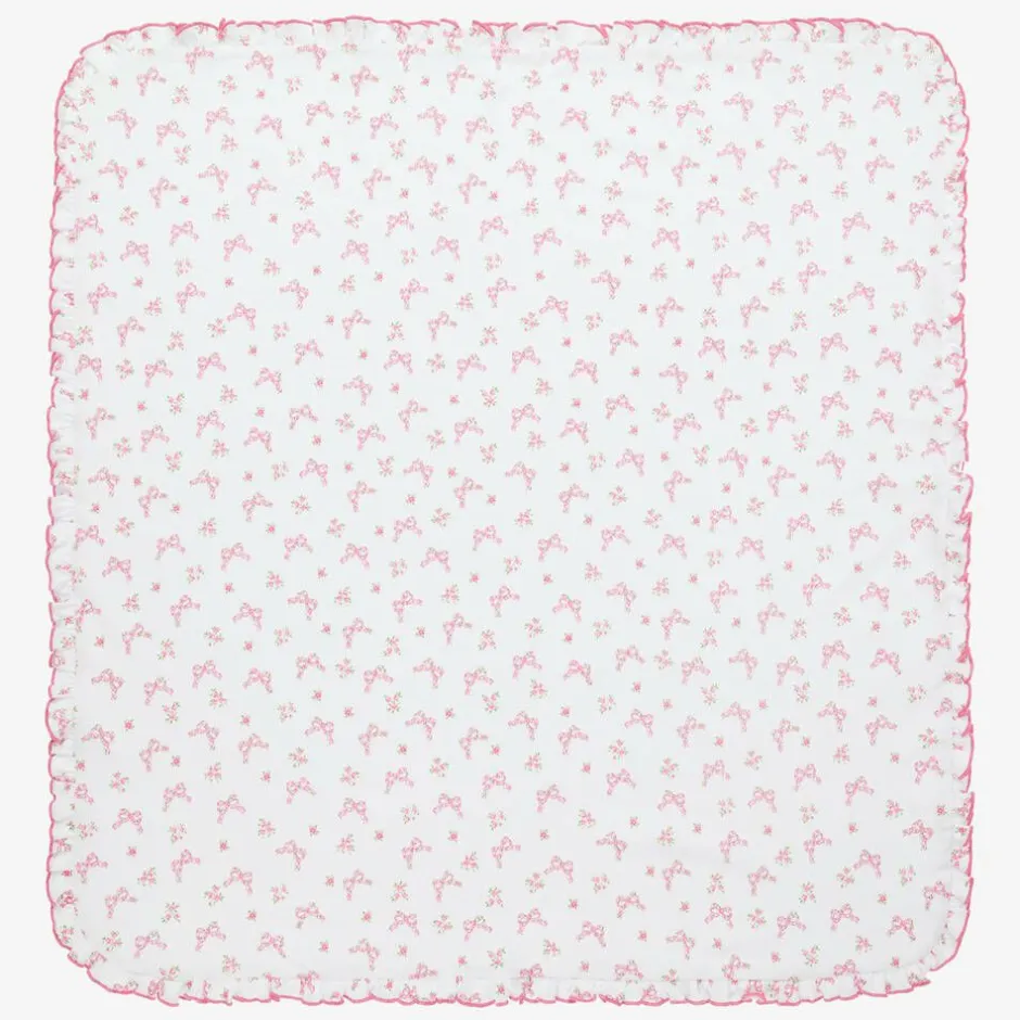 Charming white and pink Pima cotton blanket for baby girls by Kissy Kissy, made in super soft jersey. Trimmed with a pretty ruffle and pink embroidery, it is patterned with bows and flowers in pink and green. It is made in a cosy double layer with a plain white reverse side and is an ideal accessory for the nursery and pram.
