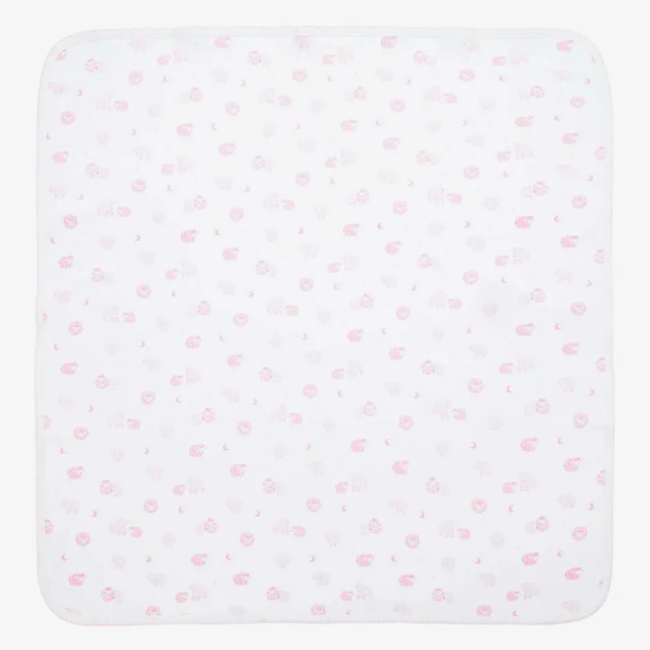White blanket for baby girls by Kissy Kissy, made in a double layer of soft, stretchy Pima cotton jersey. One side has a cute pink sheep pattern with pretty pink picot trims. The reverse is plain white. This lovely accessory is ideal for use in the nursery or when out and about in the pram or car seat.
