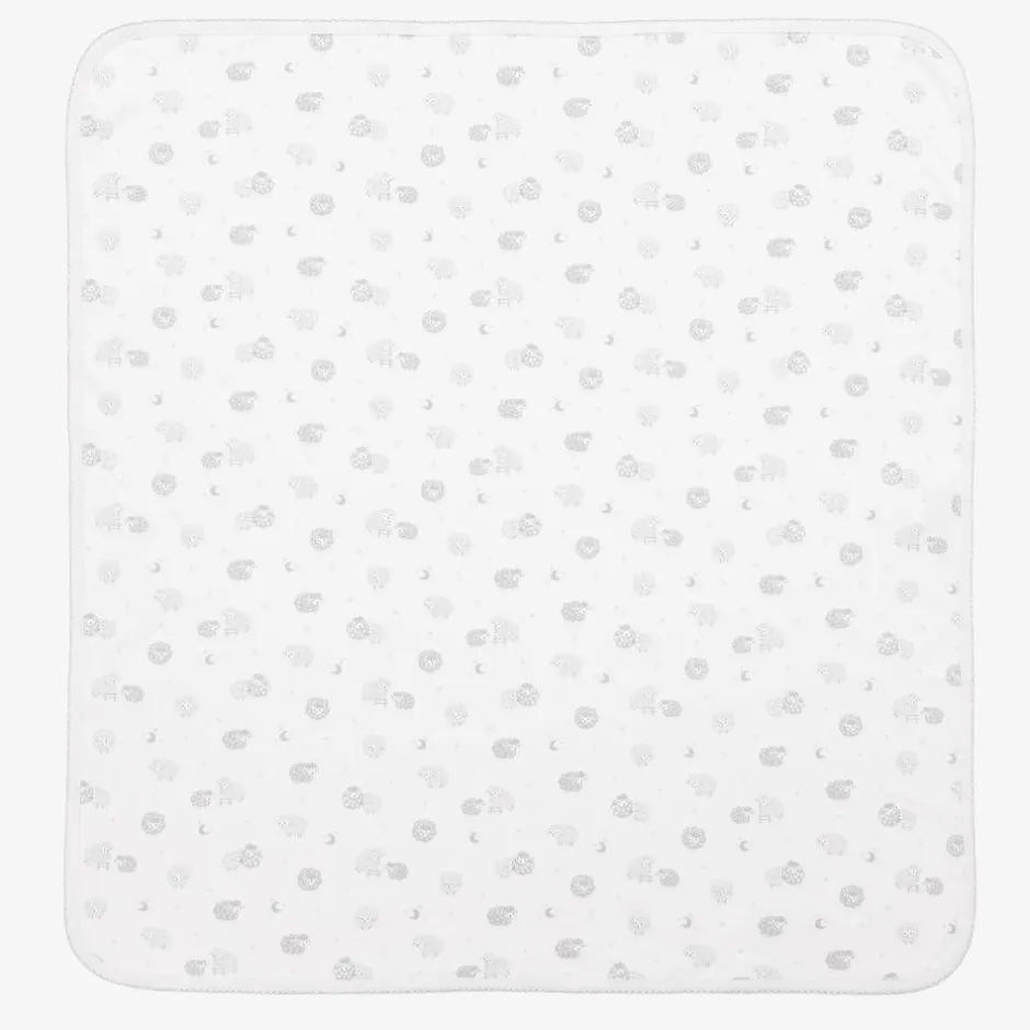 White blanket for baby boys and girls by Kissy Kissy, made in a double layer of soft, stretchy Pima cotton jersey. One side has a cute grey sheep pattern with grey picot trims. The reverse is plain white. This lovely accessory is ideal for use in the nursery or when out and about in the pram or car seat.