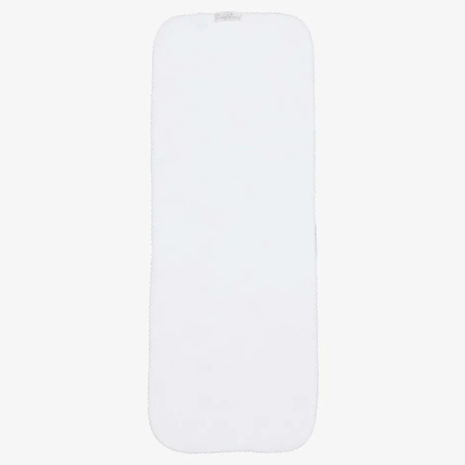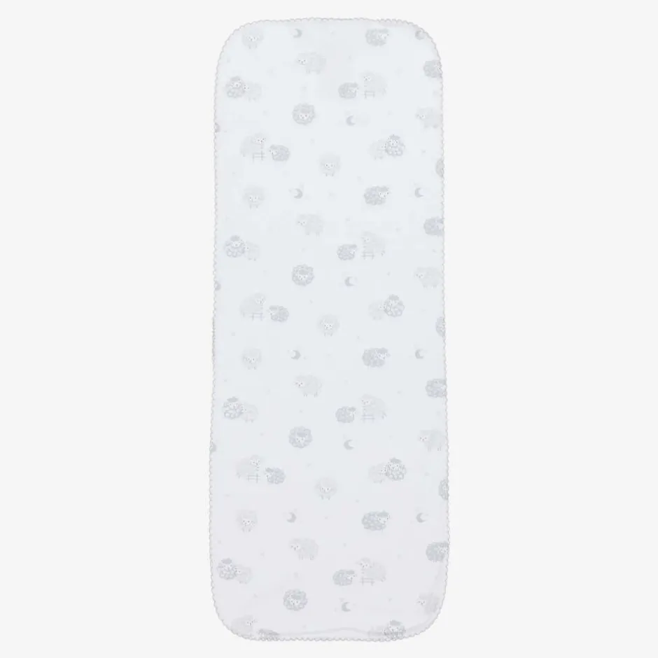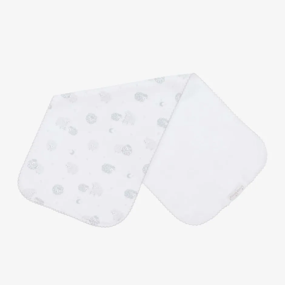 A white burp cloth for baby boys and girls by Kissy Kissy, with a cute grey sheep pattern. Ideal for placing over the shoulder when burping baby, it is made in soft Pima cotton jersey and lined in absorbent towelling.