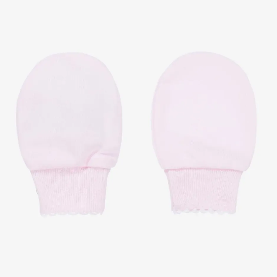 A pair of pale pink scratch mittens for baby girls, by Kissy Kissy. Soft and stretchy, they are made in comfortable Pima cotton jersey, ideal for delicate skin. They have white picot trim and ribbed cuffs, so they stay securely on little hands.