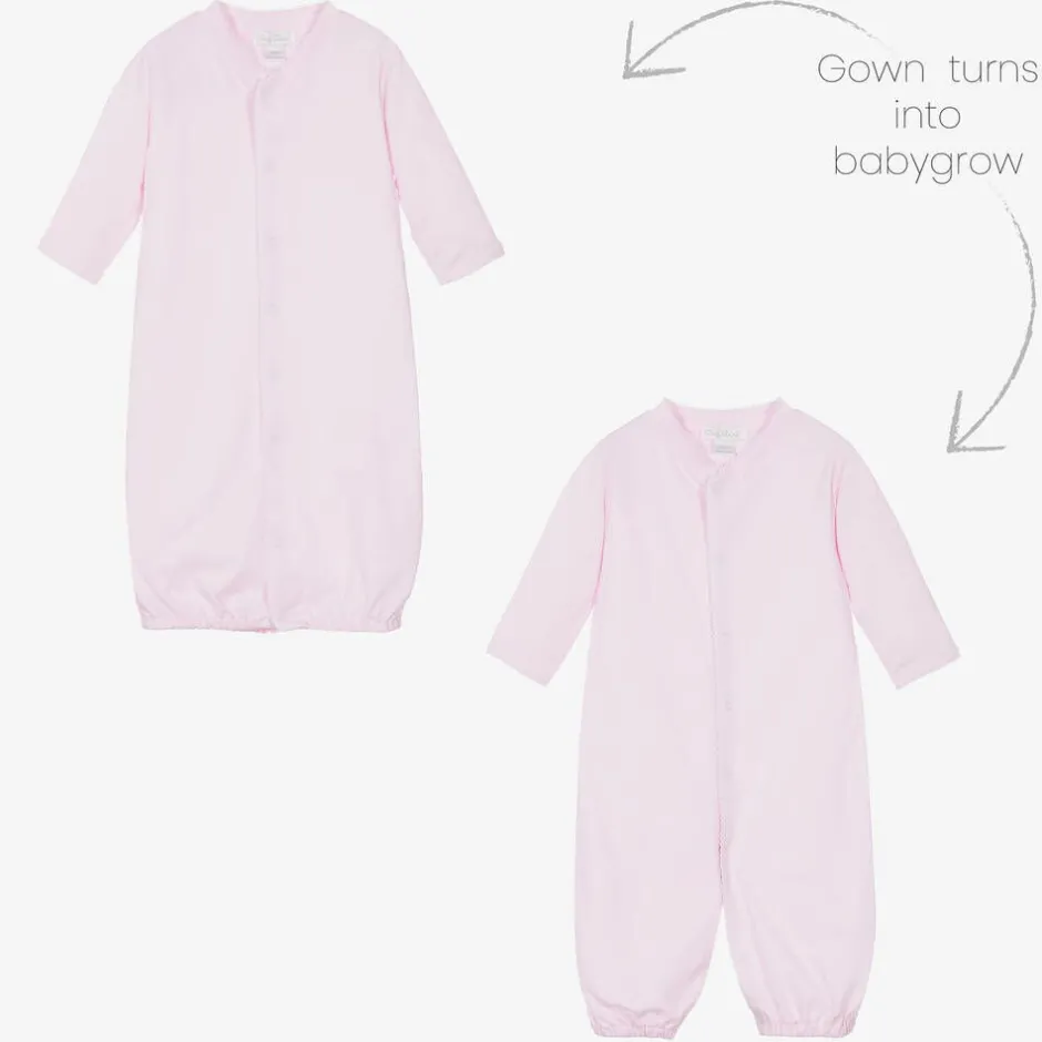 A pink baby converter gown with scalloped trims for girls by Kissy Kissy, made in the softest Pima cotton jersey. It has an elasticated hem and simply pulls up, and can be worn as a babygrow or as a gown.
