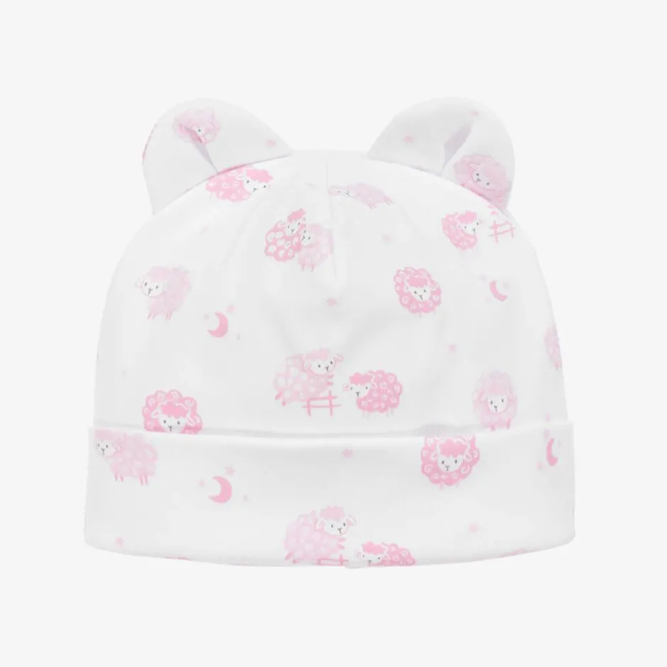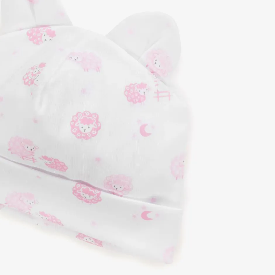 A white layette hat for baby girls by Kissy Kissy, made in a double layer of beautifully soft Pima cotton jersey. This sweet hat has a cute, pink sheep pattern, with a turned-up brim and little 3D ears on the top.