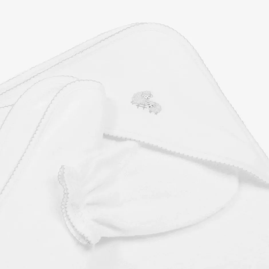 White hooded towel and mitt set for baby boys and girls by Kissy Kissy. Soft, fluffy and ideal for bath time, both pieces are made in absorbent cotton towelling, with grey picot trims. The hood of the towel is trimmed in super soft cotton jersey and has a cute embroidered grey sheep.