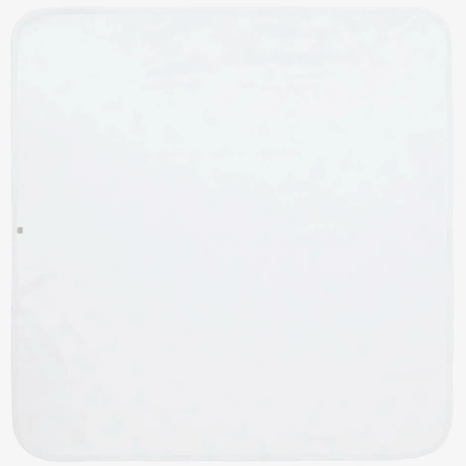 Beautifully soft white and blue blanket for baby boys by Kissy Kissy, made in a double layer of Pima cotton jersey. The front side has a sweet pale blue mummy and baby giraffe pattern and blue stitching detail around the edge. Adorable as a nursery accessory, it is also ideal for use in the car seat or stroller.