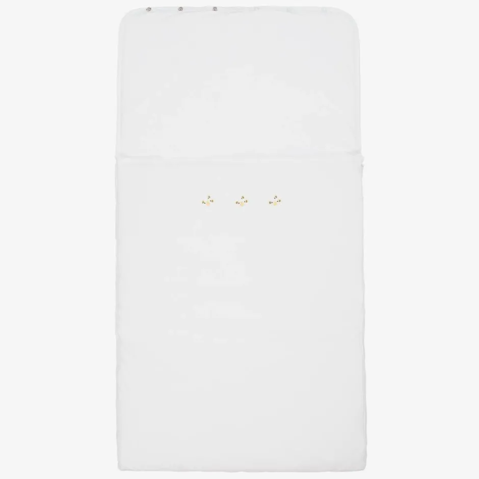 Exclusive to Childrensalon, a white nest for baby boys and girls by Kissy Kissy, made in super soft Pima cotton jersey. Lightly padded for extra warmth, this cosy nest has cute bees and bee hives hand-embroidered on the front. It fastens with a zip along the side and has a popper fastening hood, which can be laid flat and used as a pillow.