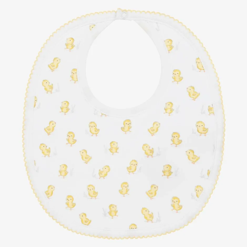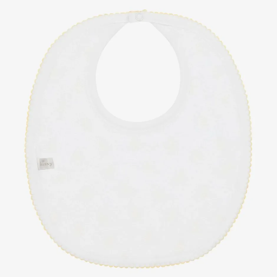 A cute white bib for baby boys and girls by Kissy Kissy, patterned with little yellow ducklings. Made in soft Pima cotton jersey, this useful feeding accessory is lined with towelling for extra absorbency. It has a delicate picot trim and fastens on the back of the neck with a popper.