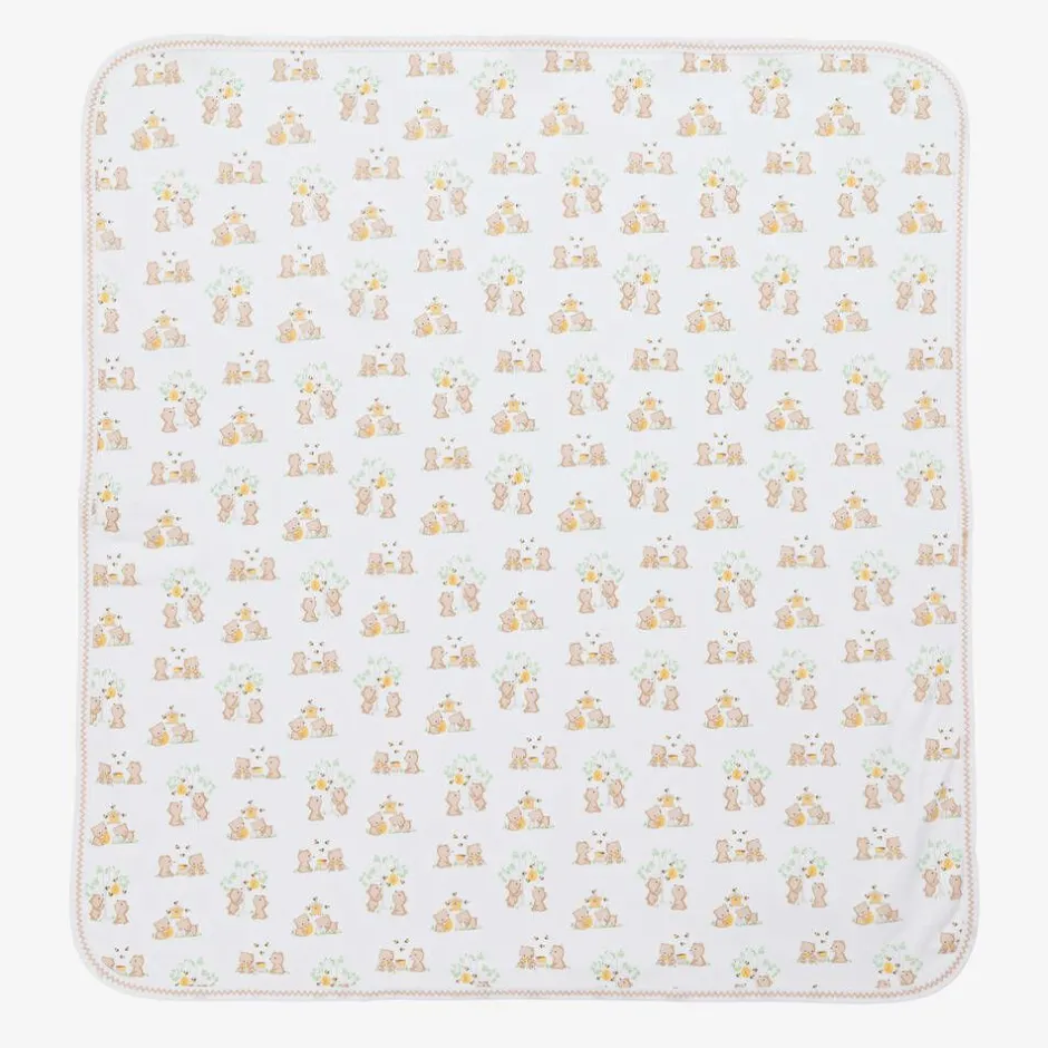 White blanket for baby boys and girls by Kissy Kissy, made in a double layer of soft and stretchy Pima cotton jersey. The front is patterned with the cutest little bear cubs and bee hives with beige picot trims. The reverse is plain white. This lovely accessory is ideal for use in the nursery or when out and about in the pram or car seat.