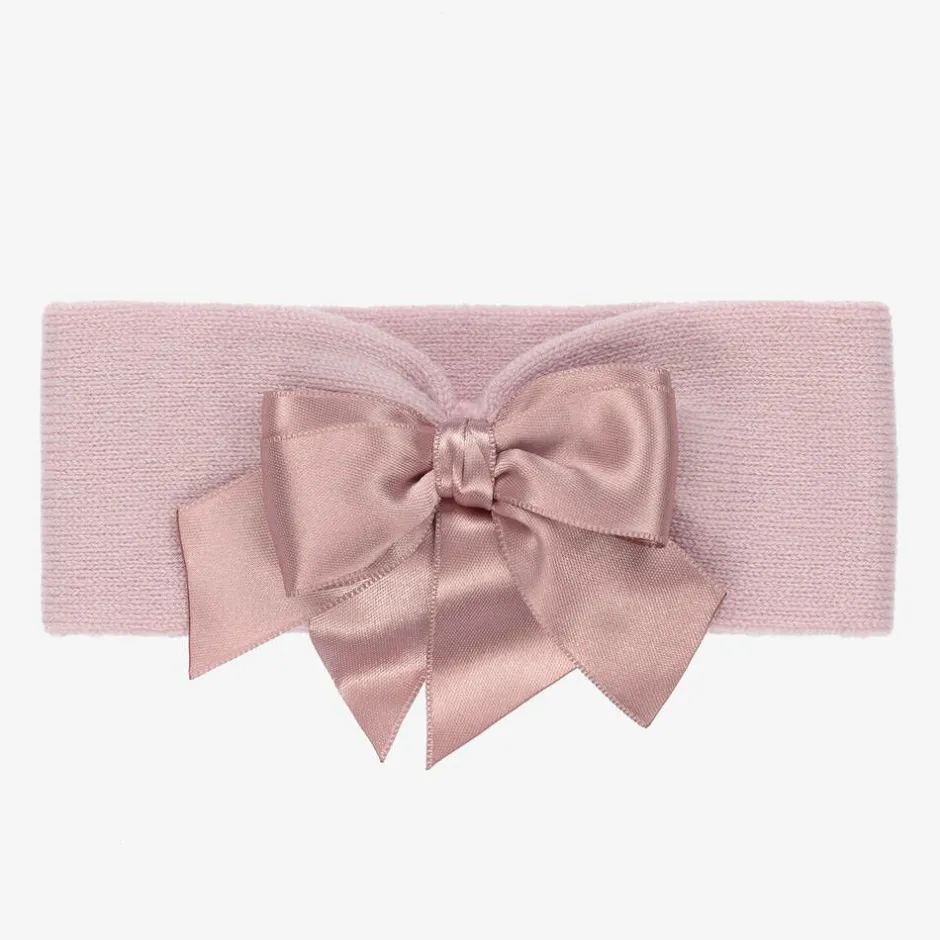 Younger girls dusky pink headband by La Perla. Knitted in soft wool for comfort and warmth, it is soft and stretchy and embellished with a satin bow in the centre.