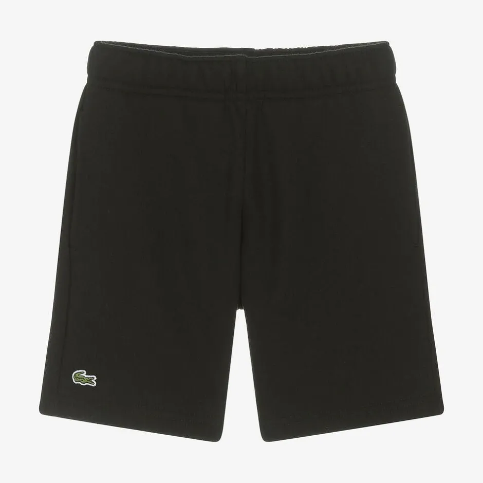 Black jersey shorts for boys by Lacoste, made in a soft blend of organic cotton and recycled materials. With a soft fleecy inside, they have concealed side seam pockets and an inner drawstring for adjustable comfort. The brand's crocodile logo can be seen on the leg, completing the casual style with a touch of branding.