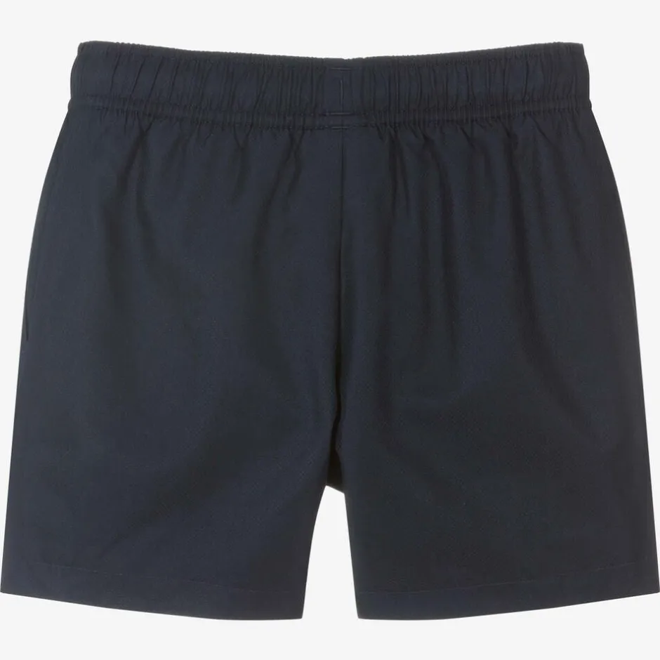 Navy blue sports shorts for boys by Lacoste, with the brand's iconic crocodile logo appliquéd on one leg. Using recycled materials, the external fabric is made in a technical diamond weave taffeta that is light weight, quick drying, and crease-proof. Lined in soft jersey, they have useful side pockets and an elasticated waistband with an internal drawstring for comfort.