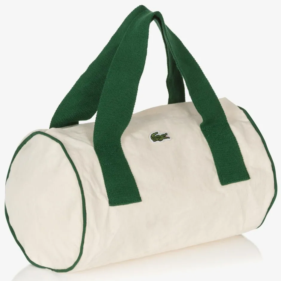 Casual grey marl tracksuit for baby boys and girls by Lacoste, made in mid-weight organic cotton jersey. It has a warm fleecy inside and ribbed trims for a cosy feel. The joggers have a comfortable elasticated waist, and the sweatshirt has shoulder popper fastenings to help with dressing. It comes with a cute little ivory and green cotton duffle bag with velcro, designed to look like a mini sports bag and spacious enough to carry a few small essentials. All pieces display the brand's iconic crocodile logo on the front.
