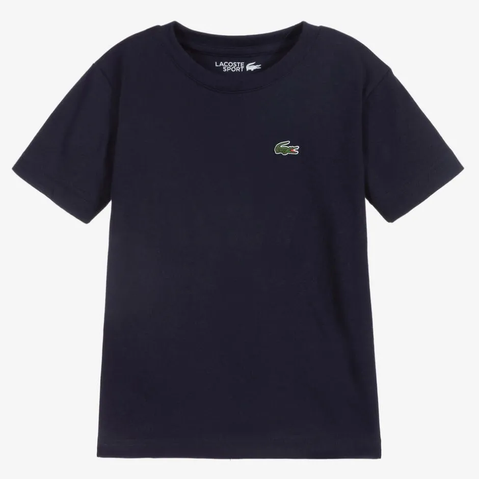 Navy blue T-shirt for boys and girls by Lacoste, ideal for sports and exercise. Made in breathable, ultra-dry technical jersey, this short-sleeved top has the label's iconic green crocodile logo appliquéd on the chest for a branded look.
