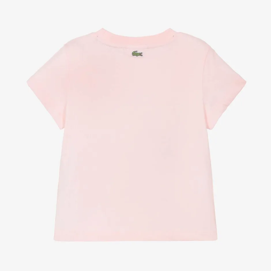 Pink T-shirt for boys and girls by Lacoste, made from soft organic cotton jersey. Ideal for casual wear, it has the brand's signature crocodile logo printed on the front in white and a green crocodile patch on the back of the neck.