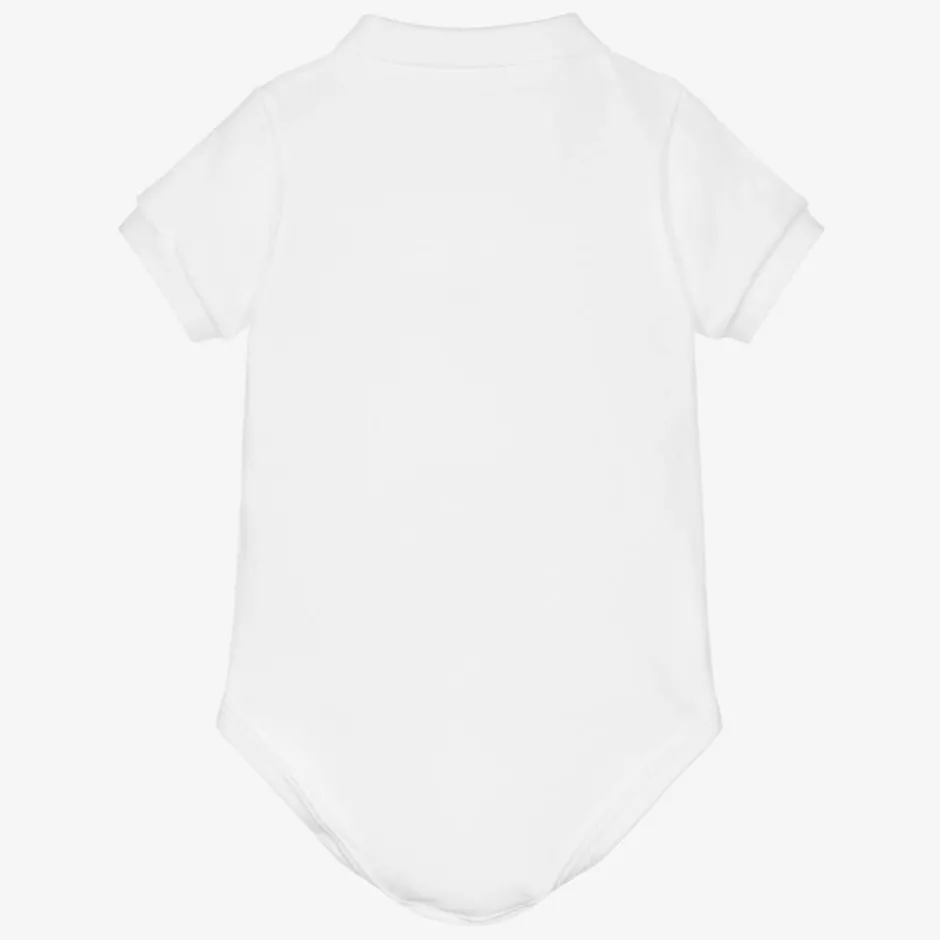 White bodysuit for baby boys and girls by Lacoste, with the brand's iconic crocodile logo on the chest. It is made from super soft organic cotton in the brand's petit piqué for optimum comfort. It has a classic polo collar, button fastenings and practical popper fastenings between the legs to make changing easier.