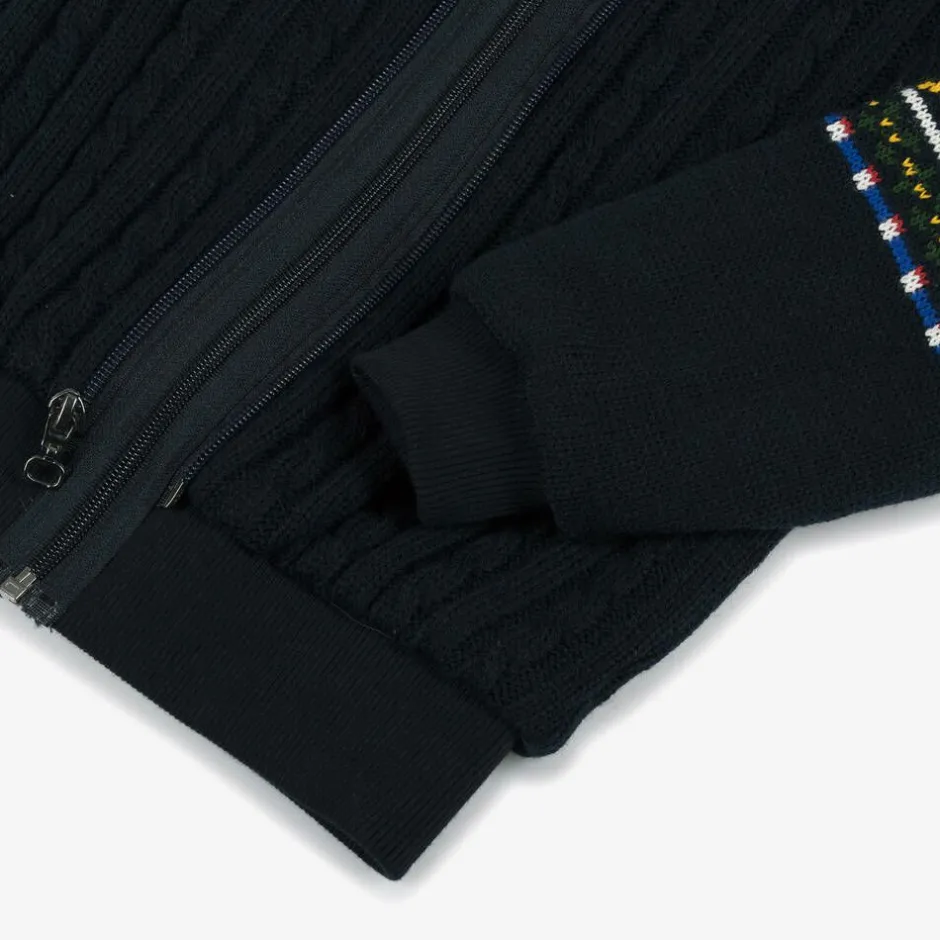 Cosy navy blue gilet and zip-up top combination for boys by Lapin House, which can be worn as one, or separately. The silky, padded, puffer gilet has an attached hood, lined in ivory fleece, and useful side pockets. It fastens on the front with a zip, or can zip onto the sweater as an extra layer. The cable-knit zip-up top has a stand-up collar and colourful patterns in the weave on the sleeves. It has warm, ribbed trims and is fully lined in jersey for comfort.