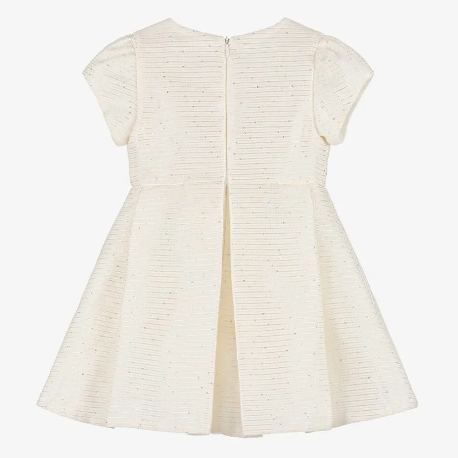 Beautiful ivory special occasion dress for girls by Lapin House, woven with shimmery stripes and delicate sequins. Designed with a stunning bow on the front, this pretty dress has puffed capped sleeves and a flared skirt with wide box pleats. It is comfortably lined in soft cotton and fastens neatly with a concealed zip on the back.