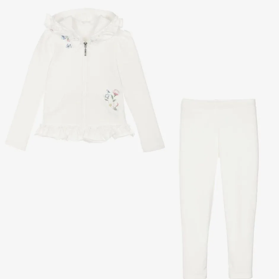 Pretty ivory cotton leggings set for girls by Lapin House. The soft, stretchy jersey zip-up hoodie has frills and floral motifs in pink and blue, with a cosy, fleecy lining. The super soft velour leggings are full-length and have an elasticated waist for a comfortable fit.