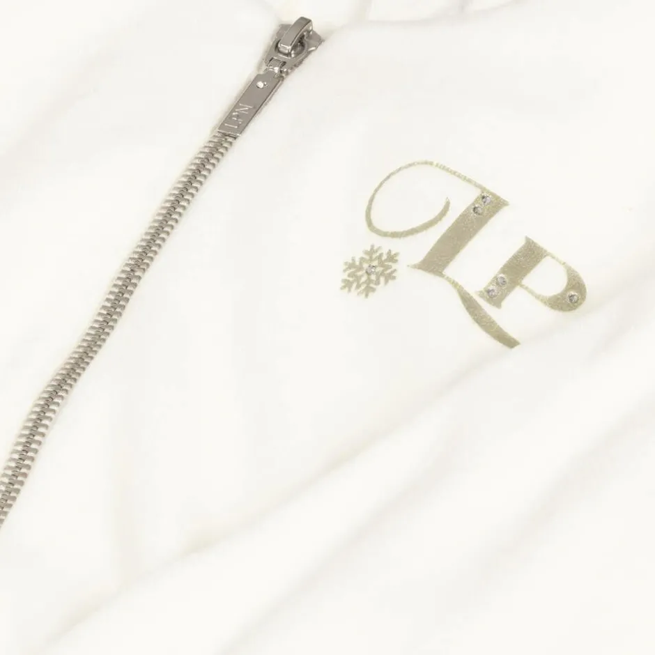 Stylish ivory cotton tracksuit for girls by Lapin House, made in soft, comfortable velour. The zip-up hoodie has a pale gold logo and snowflake printed on one side, with sparkling diamantés, and a coordinating, glittery stripe around the ribbed hemline. The joggers have patch pockets on the front and popper-fastening flap pockets on the back.