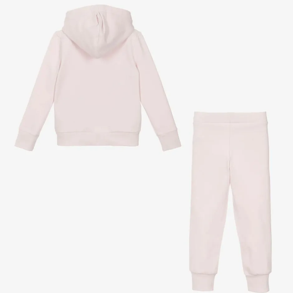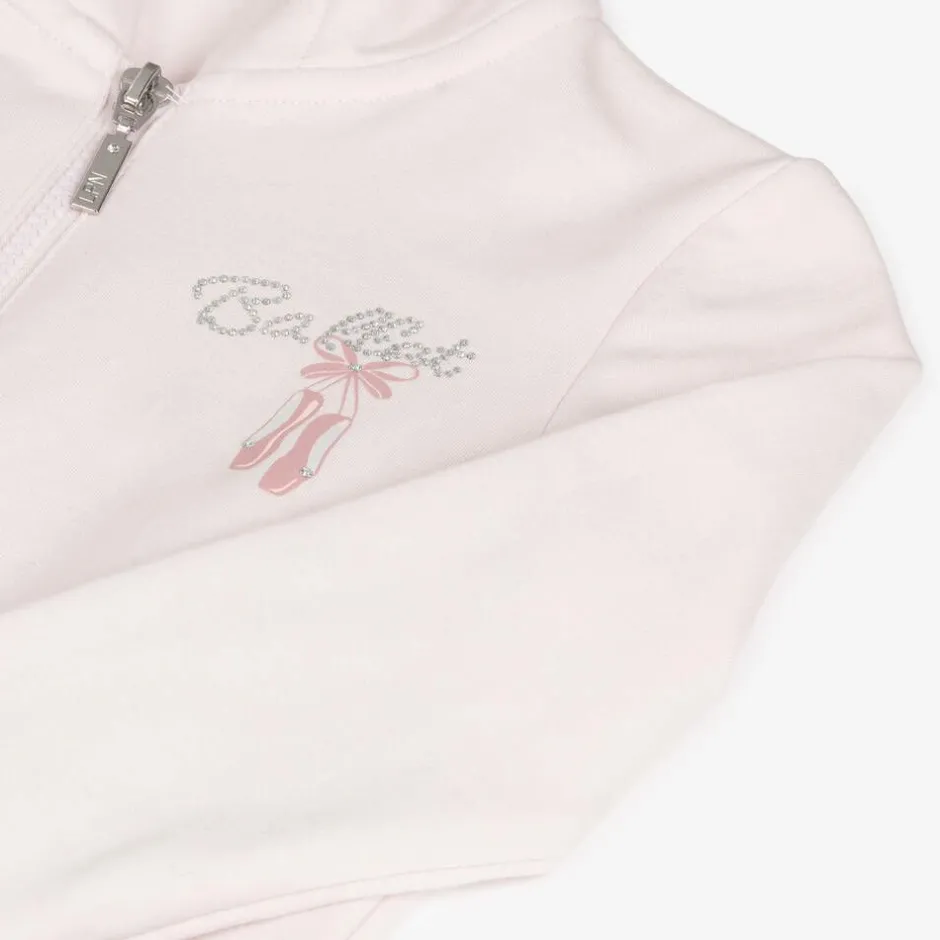 Pale pink cotton tracksuit for girls by Lapin House. The zip-up hoodie has the word 'Ballet' sparkling in diamantés on the front, with ballet shoes in contrasting pink. The joggers have coordinating diamantés trimming the useful side seam pockets. The tracksuit is made in soft, comfortable jersey, with a brushed inside.