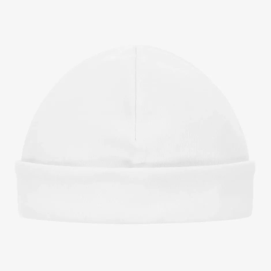 Lovely white layette hat for baby boys and girls, by Laranjinha. Ideal for tiny babies delicate skin, it is made in luxuriously soft cotton jersey and has a sweet turned-up brim with a logo tab on the side.