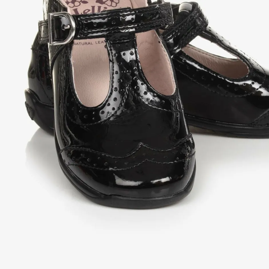 Traditional black bar shoes for girls by Lelli Kelly, made in soft patent leather. Lovely as school shoes or smart occasion shoes, they have pretty brogue detailing and a buckle fastening strap across each foot. The insole and lining are made in soft, supple leather and have padding for extra comfort and support.
