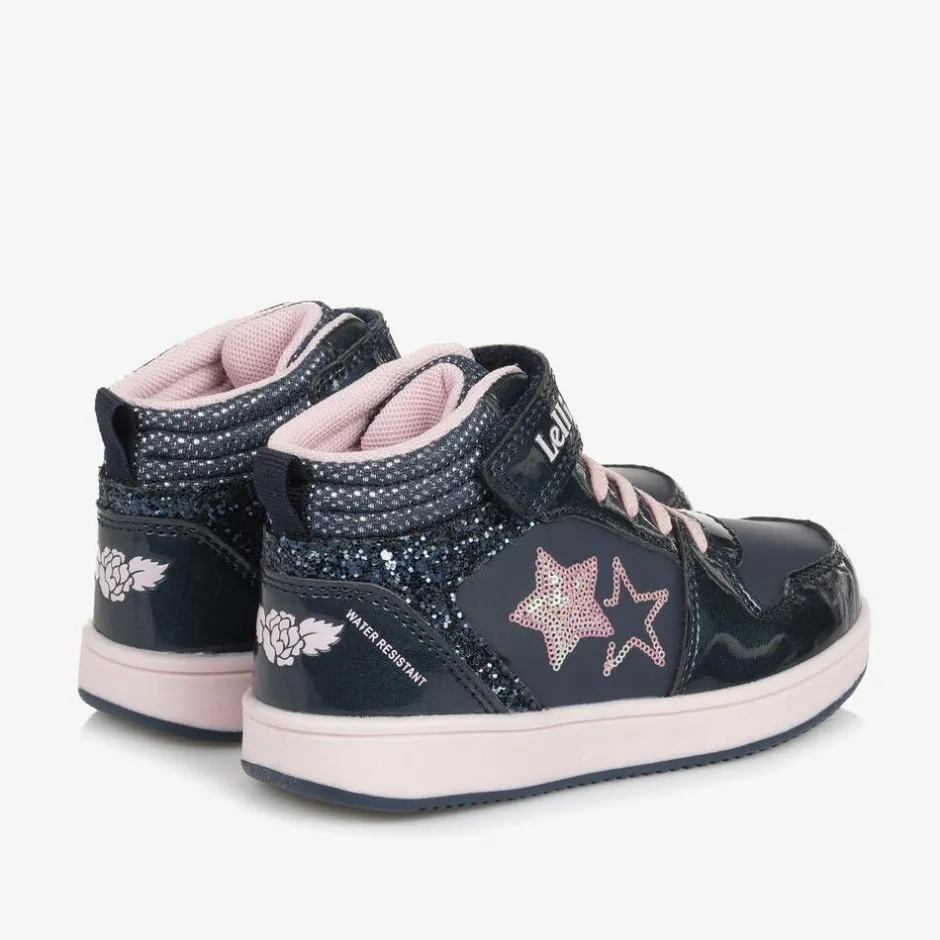 Navy blue high-top trainers for girls by Lelli Kelly, with pink sequin stars on the sides and glittery trims for additional sparkle. Made in smooth faux leather, they have elasticated laces for easy pull-on and a velcro strap for an adjustable fit. They are lined in lightly cushioned textile, with a padded insole for comfort and a non-slip rubber outer sole providing good grip.